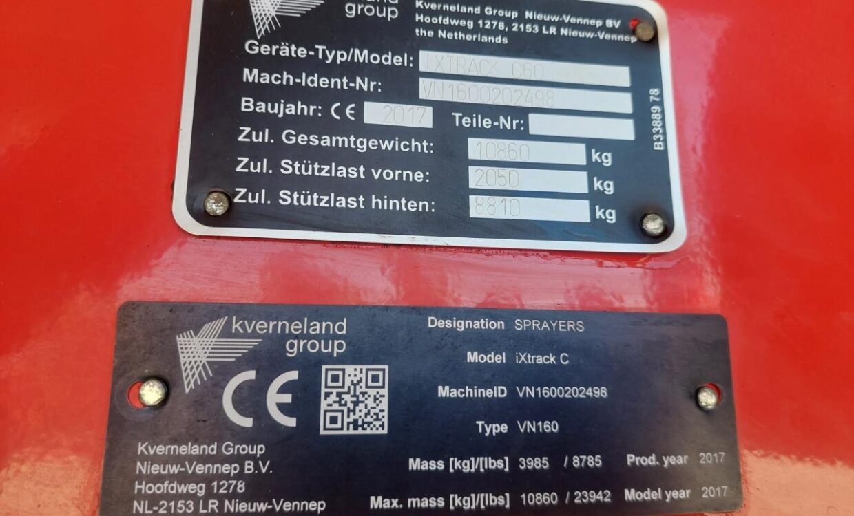 Kverneland IXTRACK C60 mit 36 m HSS-Stahlausleger. Boomguide Pro, die den Ausleger sowohl in positive als auch in negative Richtungen antreiben können. Ixclean pro Waschprogramm, gefederter Antrieb und Radachse, mit 380/90R46 Radsatz, hydraulische Bremsen und Stützfuß. Ein Bedienfeld ist im Lieferumfang enthalten, Die Siebspritze Tellus läuft über ISO-BUS. Der Boom ist unterteilt in 9 Abschnitte, mit zugehöriger eigener Antenne. Isomatsh-Inline-Terminal zur Führung von Sprühschienen ist im Lieferumfang enthalten. die Spritze bleibt sichtbar 12-2026. Nur gesprüht 20.008 ER HAT.