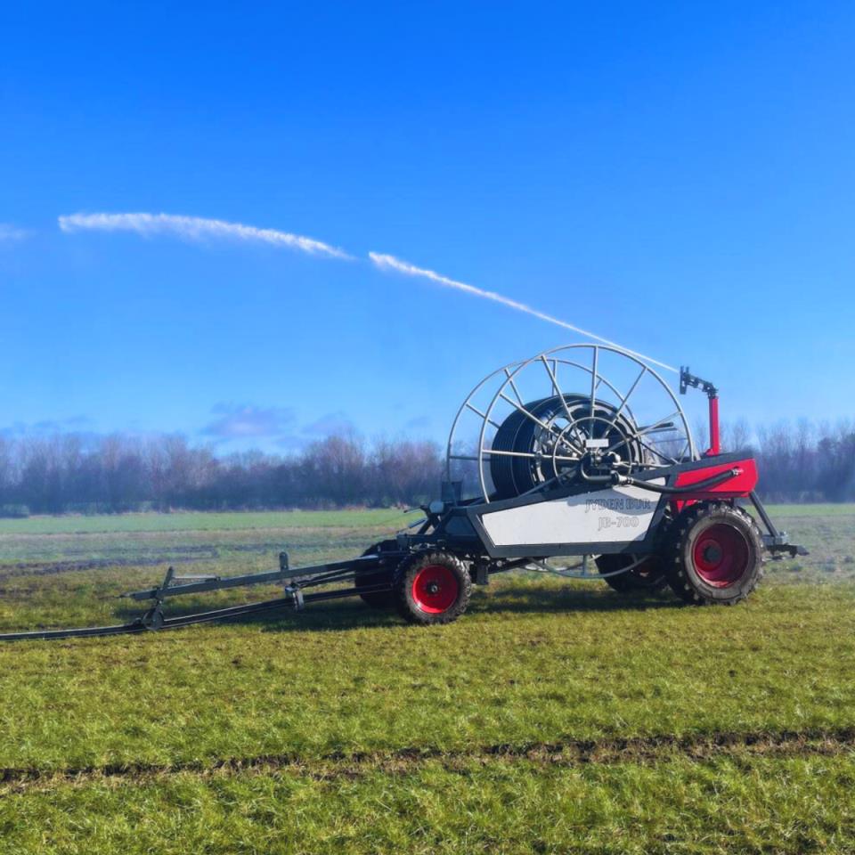 JB 700 med Ø110 X 600m slange udstyret med Nordtoft 10-12 cumputer inkl. modem og gps funktion, Stop ved over og undertryk, Komet 140 ultra med 26-28 dyse, Elbremse med fjernbetjening, Sporvidde 225cm midt, midt hjul, Hjul 22 ” for og 34 ” bag, Monteret med hydraulisk tvangstyring af forhjul, Prodsøje på begge træk, Solcelle, 5m 3,5″ fødeslange, Ekstra udstyr JB Fleet control, med reflex og lygter