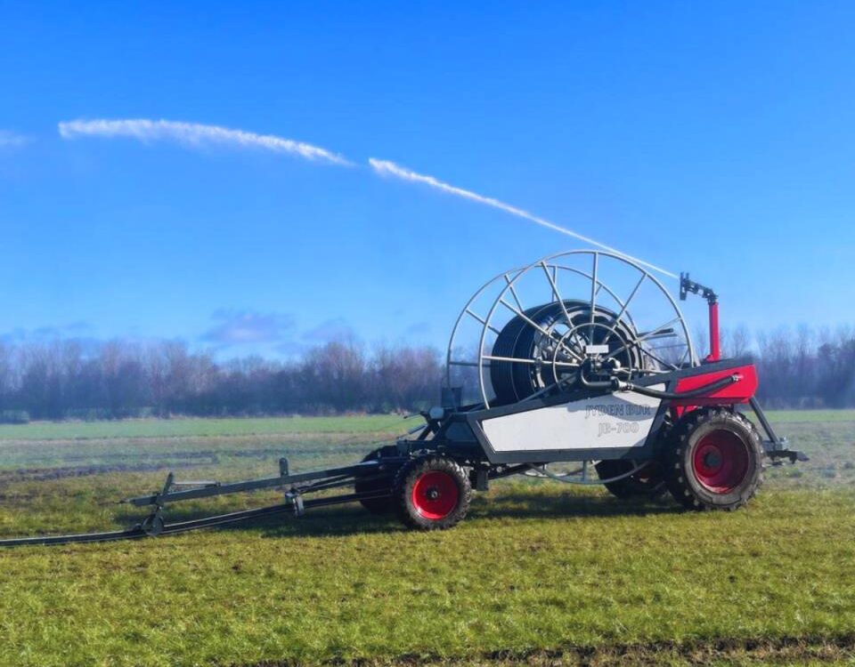 JB 700 med Ø120 X 750m slange udstyret med Nordtoft 10-12 cumputer inkl. modem og gps funktion, Stop ved over og undertryk, Komet 140 ultra med 26-28 dyse, Elbremse med kabel, Sporvidde 225cm midt, midt hjul, Hjul 22 ” for og 34 ” bag, Monteret med hydraulisk tvangstyring af forhjul, Prodsøje på begge træk, Solcelle, 5m 3,5″ fødeslange, Ekstra udstyr JB Fleet control, med reflex og lygter