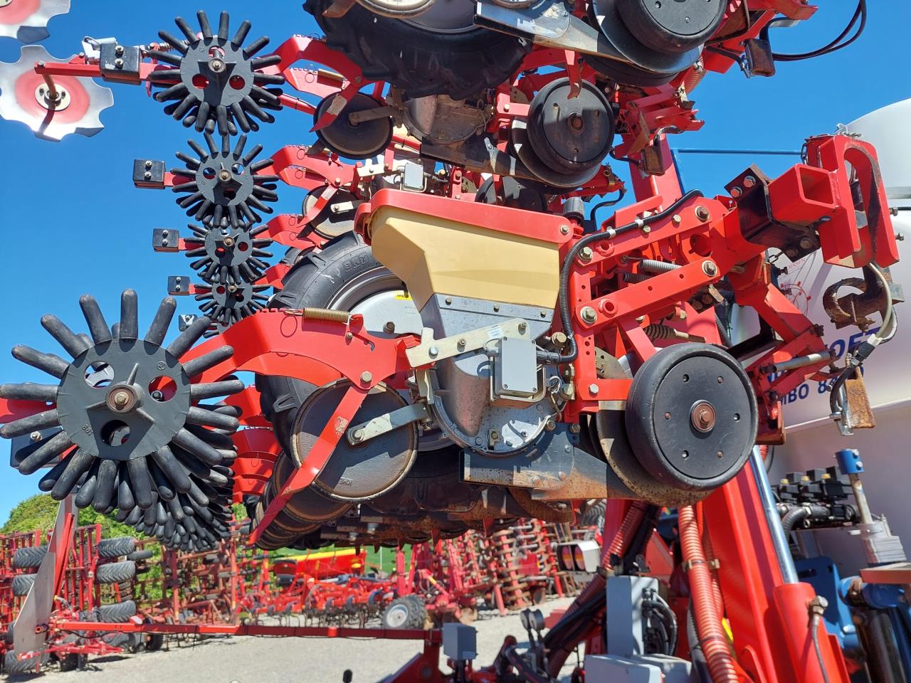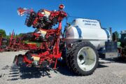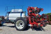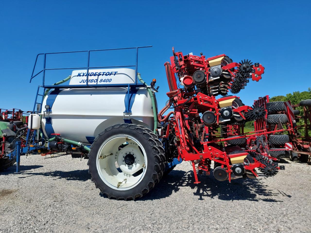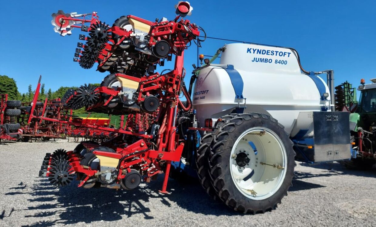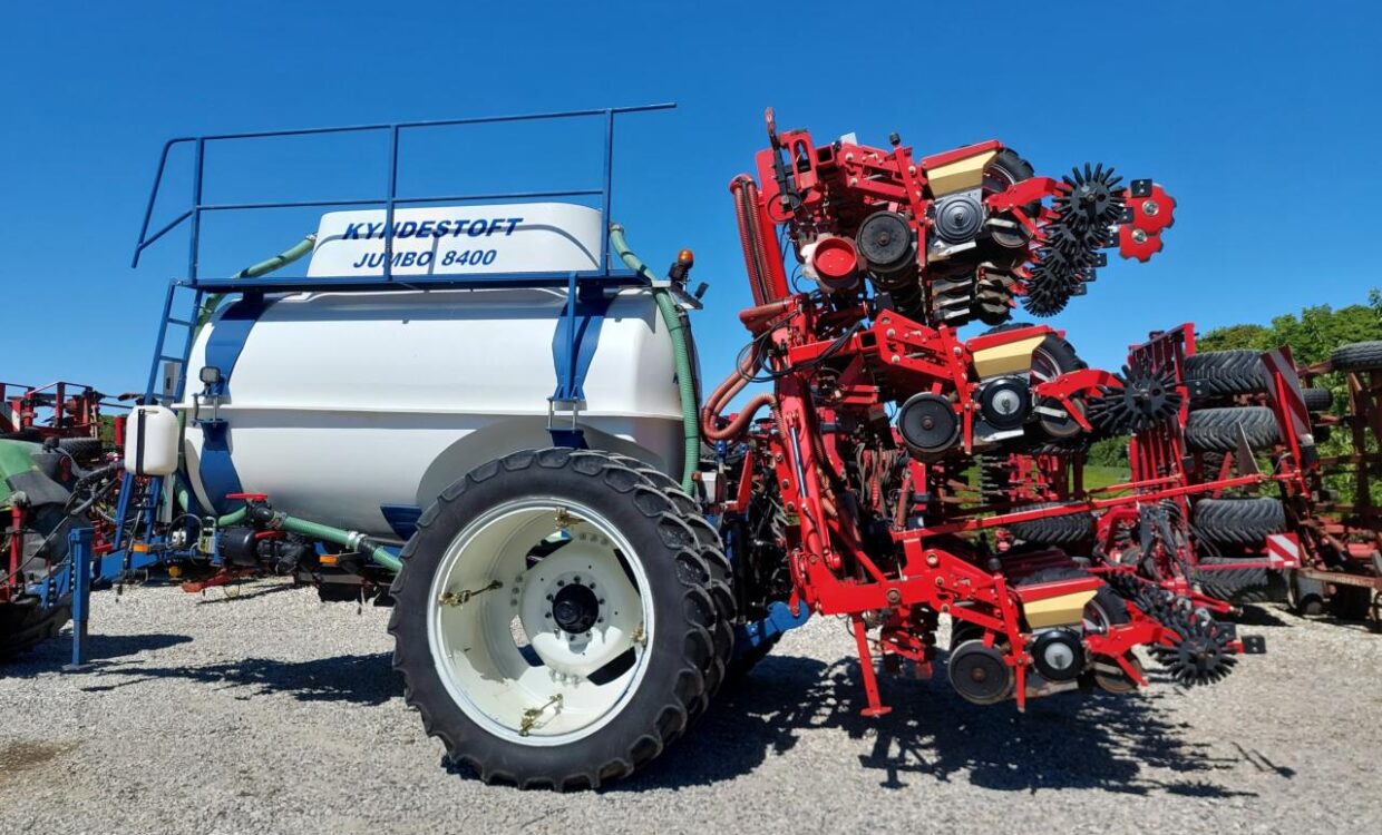 Velholdt Kverneland 18 rækket Unicorn med Syncro-Drive udstyret med stenplove, slæbetildækker, 5 cm såskær, ridsemarkør og lys. ISO-BUS styret via IsoMatch Tellus terminal med tilhørende licensnøgle GEOcontrol og maskinlicens Monteret på Kyndestoft Jumbo 8400 gødningsvogn med lykketronic terminal med 3 sektioner, 2 dobbelte virkende udtag bagud, kugletræk, frøsåkasse på siden, arbejdslys, 3″ pumpe til fyldning, 340/85R48 tvillinghjul. 18 stk nedfældertænder af germinatortand forsynet via 3 stk Quikdyser med nondryp, for hurtig doseringsændring. Afluk af gødning i sprøjtespor. Ring for yderligere info.